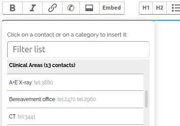 From the dropdown, select either an individual contact or a full category. It will then be inserted in the page. After saving the page, the contact entry or the category it will be nicely formatted and the numbers can be dialled on a mobile device. A contact category with many entries will have a search box to allow filtering.