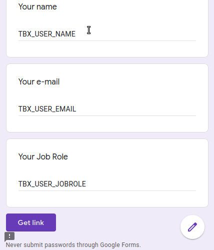 After you save the page, clicking on the link will open Google Forms with the information of the current user pre-filled -- both on the website and in the app.